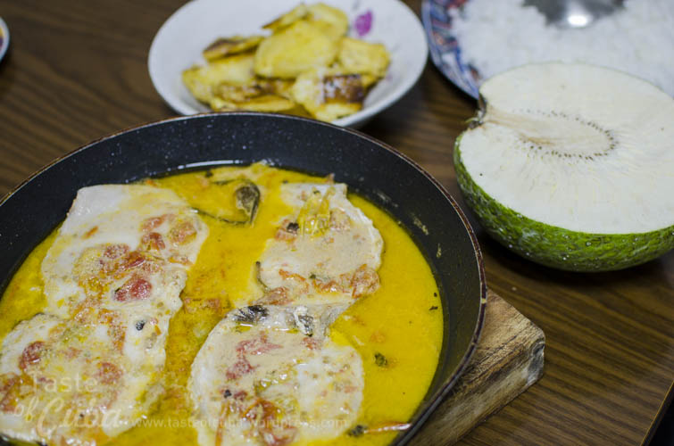 Espolvorear con sal al pescado y reservar. Se prepara un sofrito añadiendo ajo, ají chay, tomate natural cortado finamente y bija, a una sartén con aceite y a fuego bajo. Luego se condimenta la leche de coco con este sofrito y se cocina hasta que espese un poco. En la misma sartén se sellan las ruedas de pescado unos segundos por ambos lados. Luego se incorpora la leche de coco condimentada y se deja a fuego medio por 6 u 8 min.