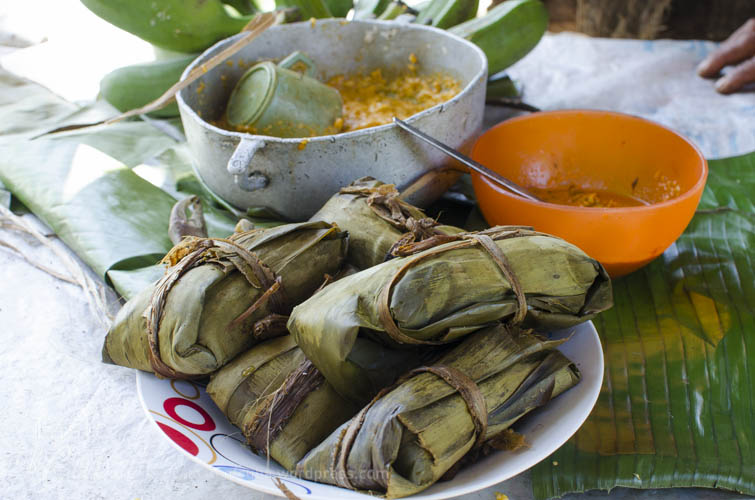 Se agregar la leche de coco lista al plátano rallado y mezclar hasta obtener una masa homogénea. Colocar porciones de esta masa en hojas de plátano, envolver y amarrar.