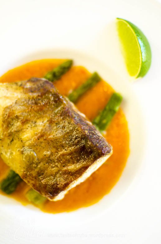 Season the fish filet. Steam the fish with the asparagus for five minutes. On the blender put the tomatoes, butter, salt and pepper and blend till creamy. Warm and put the sauce like a mirror on the plate bottom and over place the asparagus and the fish. Add some olive oil all over the filet.