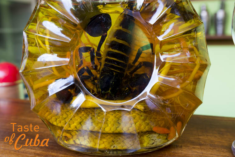 Está la curiosa botella en el bar del Hosta Casa Osmary Alberto en Trinidad. Dicen que la trajo un cliente desde un país asiático y que recomendó beber el contenido para combatir las dolencias de los huesos, el reuma y otras similares. Dentro de un líquido alcohólico que antes fue brandy y ahora está mezclado con Havana Club 7 años, reposan una cobra pequeña, un escorpión grande, raices de Ging Seng y un aporte cubano de ají picante.