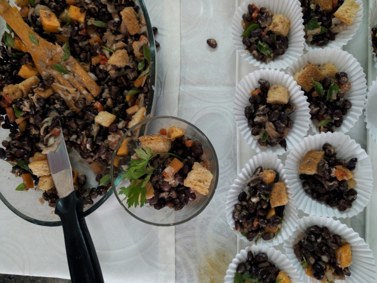 Mezcle en un recipiente frijoles hervidos, en este caso se usaron frijoles negros, añada el contenido de una lata de atún, incluya el aceite de la cosecha, agregue tomate cortado en dados, cebolla bien cortada y dados de mango.